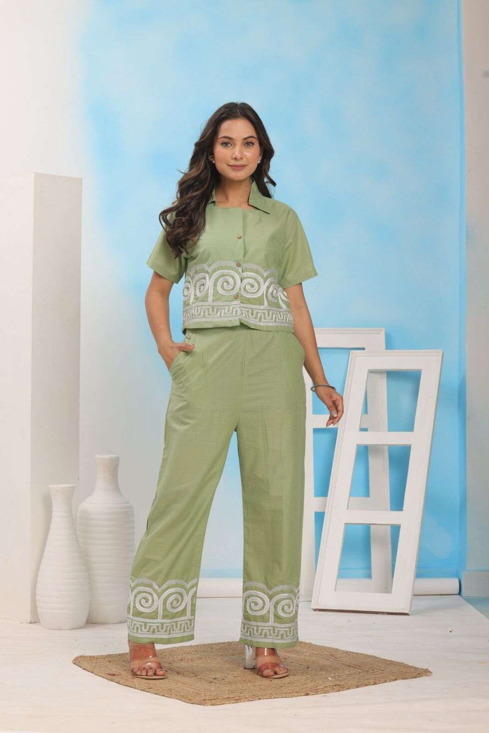 Green Color EmbroideGreen Cotton Co-Ord Set For Women’s and Girls Size-XL